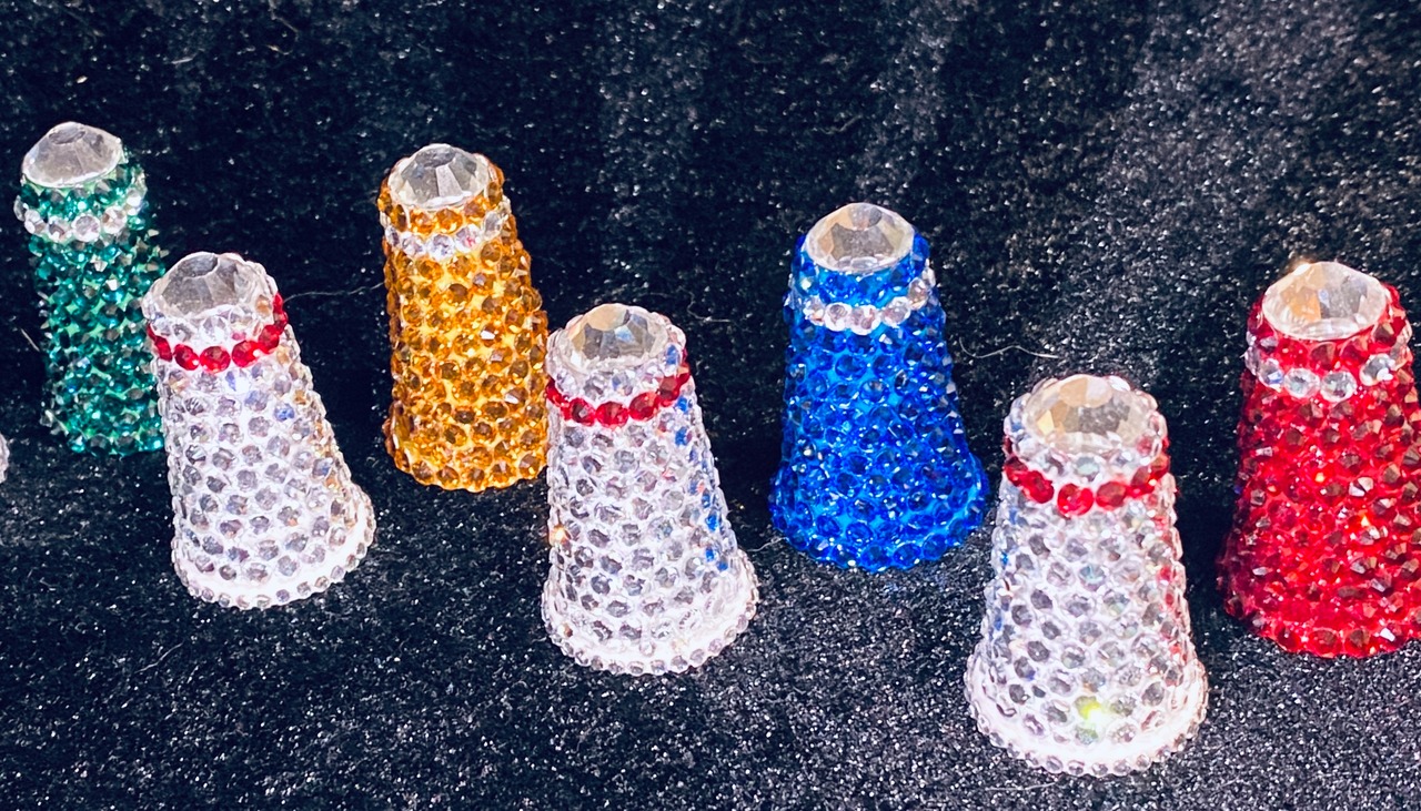 スワロフスキーでゴージャスにデコレーションされた究極のシンブル。シルバー4本、赤青黄緑各1本の計8本セットです。舞台照明を浴びた際の輝きで演技も自ずとグレードアップされること間違い無しです。安物のビーズで作られた粗悪品とは、違いますので、誤解されませんように。